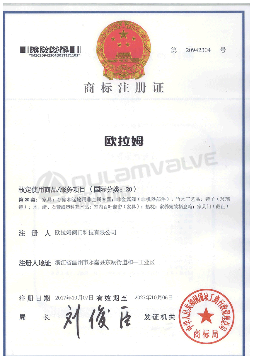 “圓形歐拉姆標志英文OULAM”商標注冊證
