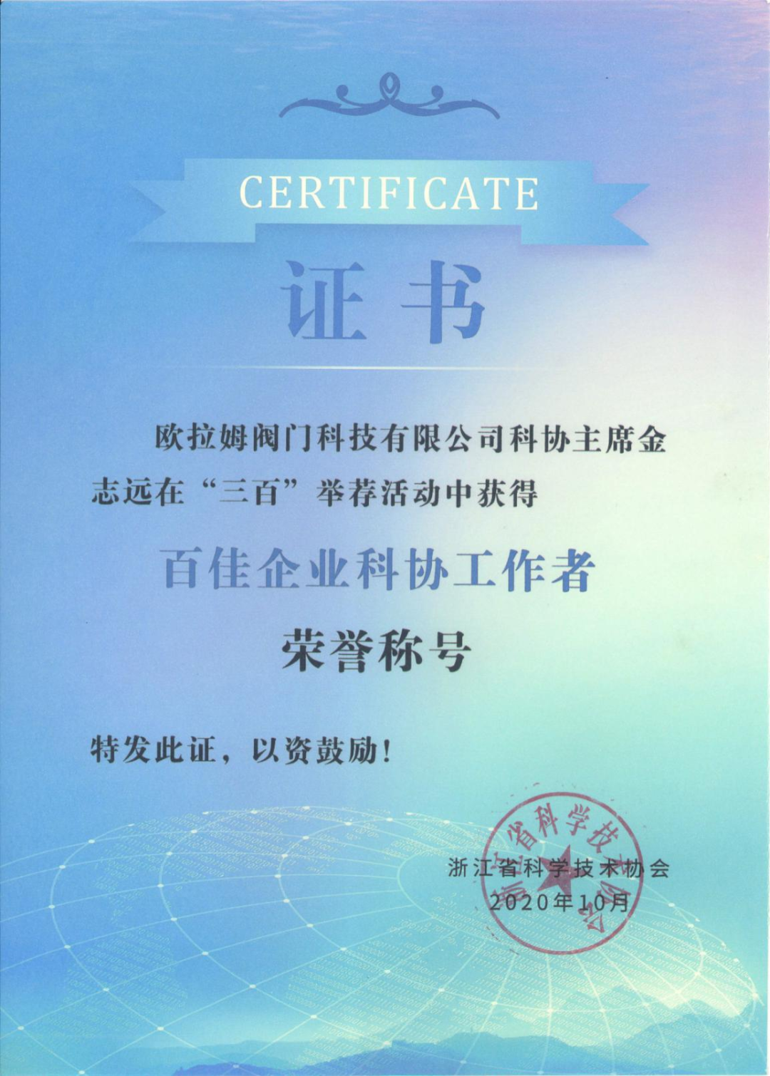 319日下午,溫州市科協十屆五次全會舉行。會上,歐拉姆公司董事長金志遠被浙江省科學技術協會授予百佳企業科協工作者榮譽稱號。