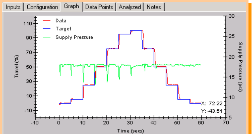 判斷閥門對輸入信號的響應能力,分析數據如死區和超調等,以判斷閥門是否處于最佳控制狀態,以及閥門的控制精度,并提供開關時間和T63、T86等響應分析。